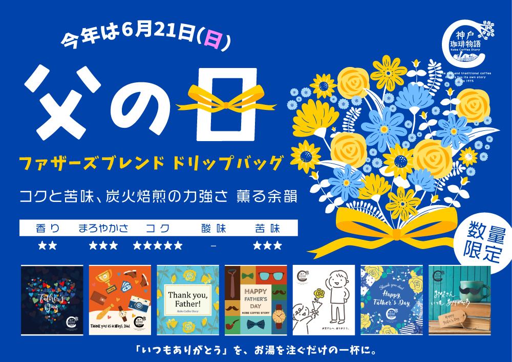 人気検索キーワード #アイスリキッド #ギフトセット #選べるブレンド セット #水出し #ドリップバッグ #フェアトレード #ハウスブレンド 神戸珈琲物語 発売前ページ 【神戸珈琲物語】 Father's Blendドリップバッグ 10g×1パック 父の日の贈り物♪19枚で送料無料に♪ | 神戸珈琲物語 公式通販 37021 価格: ¥199 (税込) [ポイント還元 9ポイント~] 販売期間: 2026年05月13日09時00分~2026年06月15日23時59分 数量: 枚 在庫 × レビューはありません ※限定生産の為、なくなり次第終了となります。また絵柄は選べません。予めご了承下さいますようお願い致します。 Father's Blend ドリップバッグ このコーヒー「炭火焙煎」炭焼コーヒー最上位のコクと苦み 香 り まろやかさ コ ク 酸 味 苦 味 ★★ ★★★ ★★★★★ - ★★★ お勧め関連商品・キャンペーン情報 COFFEE JELLY (コーヒーゼリー)| お菓子 Others | 神戸珈琲物語 公式通販 36012 「炭火の香りを食べる贅沢。ほろ苦く、とろける大人のコーヒーゼリー。」 ¥756(税込) 神戸珈琲物語 レーズンサンド 6個入り | お菓子 Others | 神戸珈琲物語 公式通販 36015 ¥1,380(税込) 冨士クリーミーマイルド500g | コーヒー関連商品 | 神戸珈琲物語 公式通販 50004 ¥740(税込) 神戸珈琲物語人気のコーヒー 選べるブレンド4袋セット (200g×4) | 13.お買い得商品 | 神戸珈琲物語 公式通販 831403 ¥5,800(税込) 神戸珈琲物語人気のコーヒー 選べるブレンド6袋セット (200g×6) | 13.お買い得商品 | 神戸珈琲物語 公式通販 831404 ¥8,300(税込) アイスリキッド 炭火珈琲 (甘さひかえめ) 1,000ml | アイスリキッド | 神戸セレクション選定商品 | 神戸珈琲物語 公式通販 30002 ¥810(税込) アイスリキッド 炭火珈琲 (無糖) 1,000ml | アイスリキッド | 神戸セレクション選定商品 | 神戸珈琲物語 公式通販 30001 ¥810(税込) アイスリキッド 濃い紅茶 (加糖) 1,000ml | アイスリキッド | 神戸珈琲物語 公式通販 30003 ¥810(税込) アイスリキッドギフトセット 3本詰合せ KCL-3/40003 | コーヒーギフト | 神戸珈琲物語 公式通販 【ギフト包装可】「炭火が香る、想いを贈るギフトー神戸珈琲 アイスリキッド」 ¥2,430(税込) アイスリキッドギフトセット 4本詰合せ KCL-4/40004 | コーヒーギフト | 神戸珈琲物語 公式通販 【ギフト包装可】 ¥3,240(税込) アイスリキッドギフトセット 6本詰合せ KCL-6/40006 | コーヒーギフト | 神戸珈琲物語 公式通販 【ギフト包装可】 ¥4,860(税込) アイスリキッドギフトセット 8本詰合せ KCL-8/40008 | コーヒーギフト | 神戸珈琲物語 公式通販 【ギフト包装可】 ¥6,480(税込) 神戸珈琲物語 カフェ オレ ベース Cafe Aulait Base 1本約15杯 アイスリキッド カフェオレ 「アイスでもホットでも楽しめる、万能カフェオレベース。」 ¥1,296(税込)