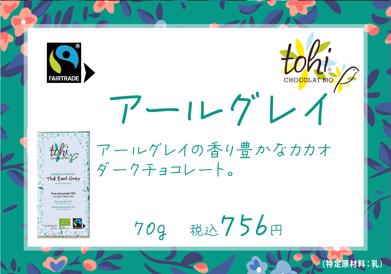 チョコレートの苦みにアールグレーの風味が加わることで、香りのハーモニーがお楽しみいただけるチョコレートです。アールグレイの茶葉入りで味のアクセントにもなっています。、フェアトレード認証のこだわりチョコレート。
